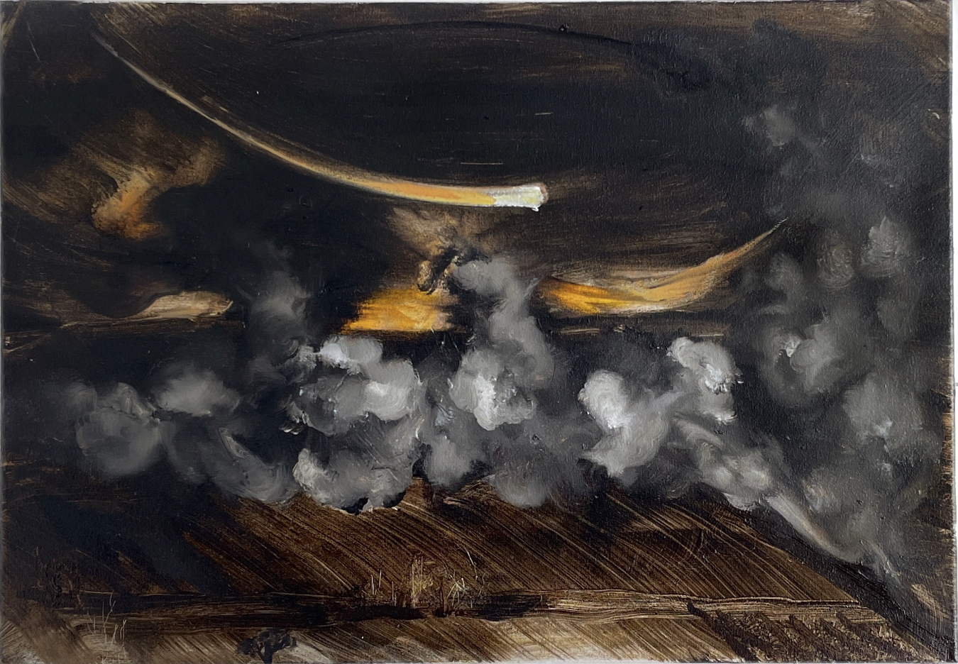 The exhibition considers how land, marked by invasion, becomes a repository of memory, carrying the traces across generations. The Ukrainian landscape is not a neutral setting but a witness- one that absorbs the trauma of war and the instability of memory. A blast wave transforms into a symbolic rupture on the canvas, where land and sky bear the weight of destruction. Trees, stripped bare, become emblems of both devastation and endurance, their twisted forms mirroring a nation’s resilience. The juxtaposition of natural elements with remnants of war- metal anti-tank hedgehogs, now scattered across cities- reflects how destruction has embedded itself into daily life. These landscapes -captured through photographic references- are shifting memories, where nature mourns, resists, and adapts, testifying to both loss and survival.