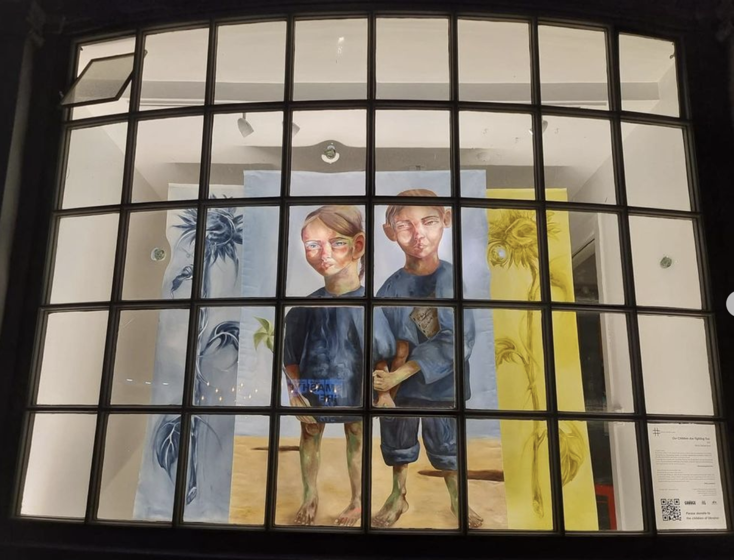 Behind the children, you see two holes in the earth. They represent the destruction the invasion caused and the bruising of the land. Europe and the world took this land that produces most of our flour and cooking oils for granted. Also depicted with this are the two sunflowers on either side of the children, as Ukraine's flag colours and represents new beginnings and new life once the war ends for Ukraine with victory.” - The Smallest Gallery in Soho website